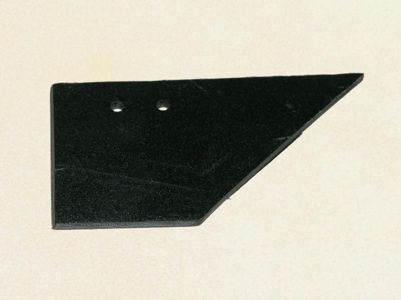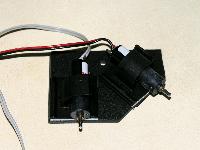 Cut out a 6 by 4 cm piece of Sintra. Cut the front on a 45-degree angle. Drill two 1/8” holes for feeding the motor wires thru.