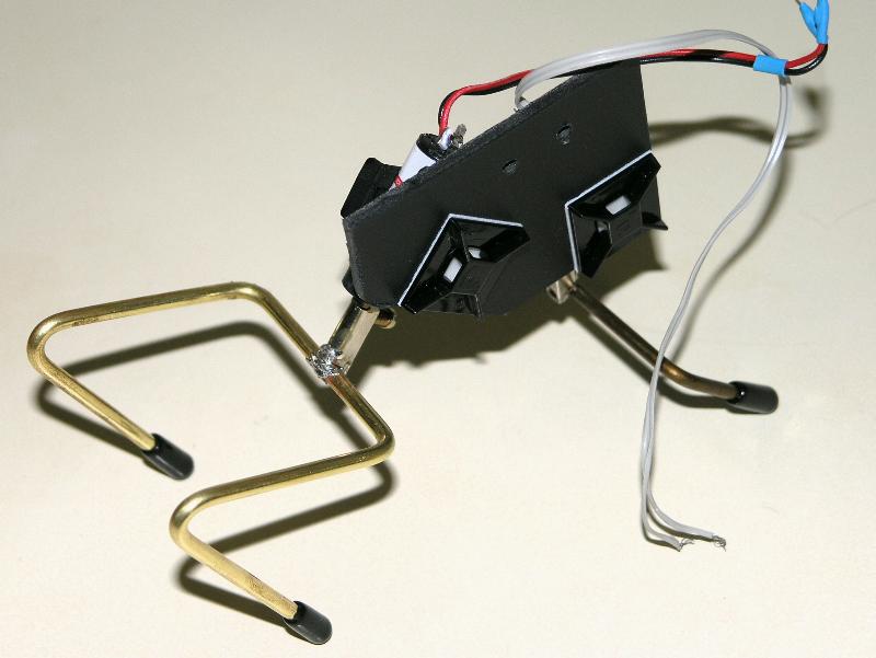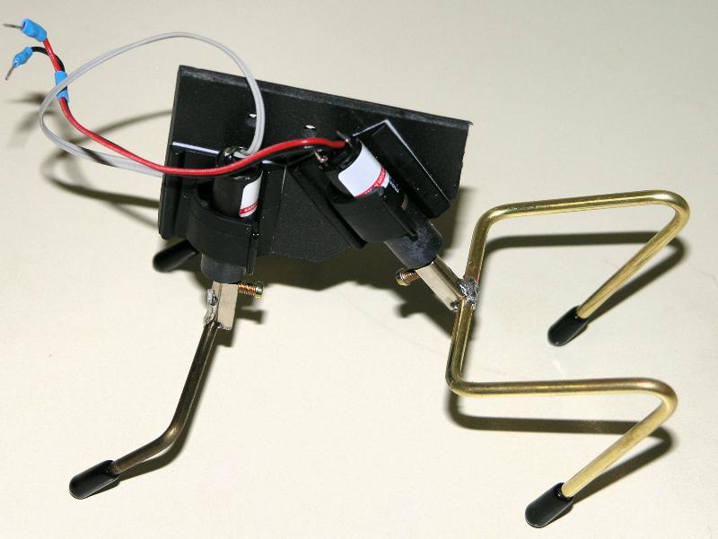 Shape the legs from 1/8” brass rod. Solder on terminal blocks for mounting the motors.
