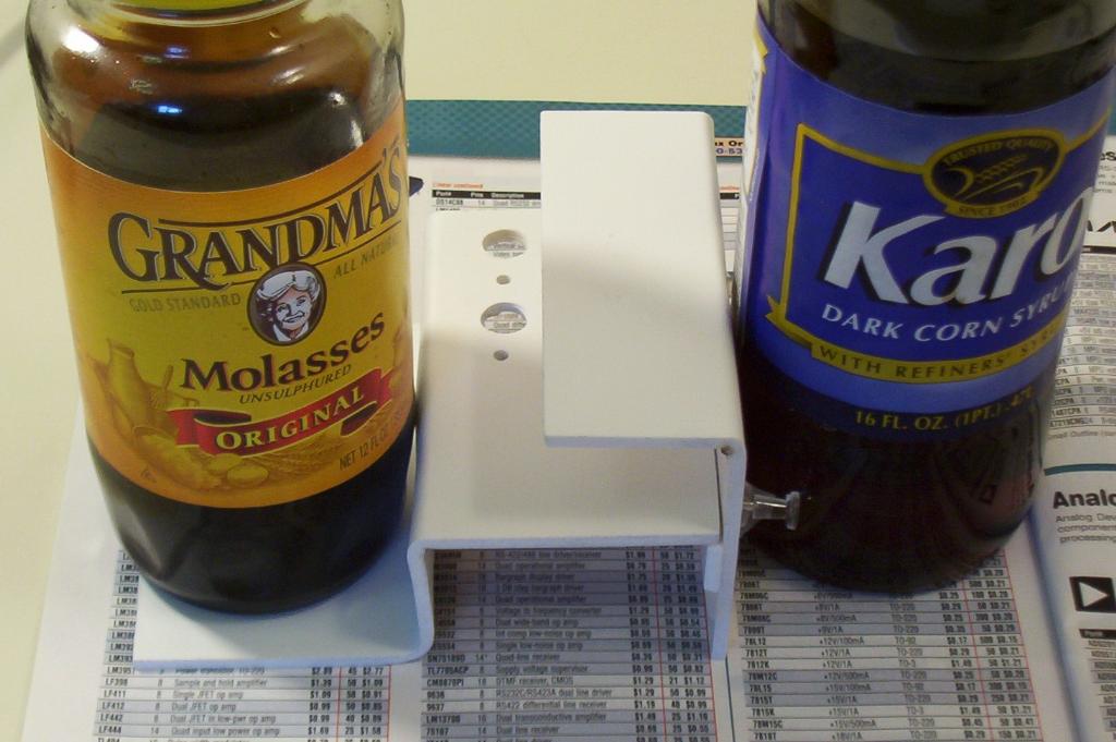 Next, glue the back brace onto the back, using pins in the holes just drilled to ensure alignment. Once that glue sets, glue the breadboard base onto the back. Use a weight such as a bottle of molasses to keep the base flat while the glue dries.
